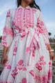 Hand-block printed dress has a flared hem, three-quarter sleeves and comes with a belt.