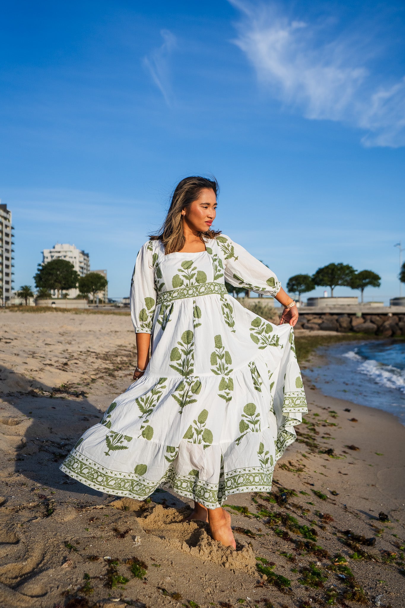 Experience our hand-blocked floral cotton dress, featuring delicate green botanical patterns on a pure white backdrop. This airy piece combines traditional craftsmanship with a modern silhouette, perfect for a breezy day by the beach or a relaxed gathering
